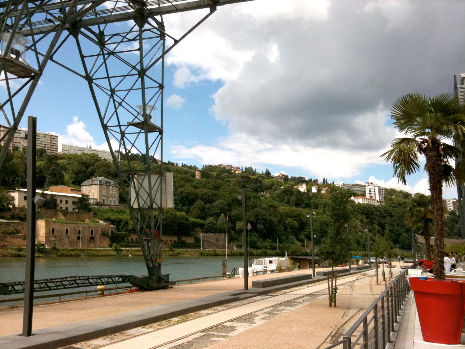 Alors que je faisais le constat que je ne sortais pas assez de chez moi, quand je suis à Lyon, et qu’il me fallait aller me promener plus souvent, mon ami Olivier décidait de son côté de nous devions… nous promener. Eh bien soit, ce fut fait aujourd’hui. Avec une balade par ses soins imaginée qui nous fit grimper dans St Just (village perché sur l’une des collines lyonnaises), continuer jusqu’à Ste Foy puis La Mulatière, et revenir par le quai Rousseau enfin rendu aux piétons car le coteau, de longue date retombé en friche, menace de s’effondrer: la sacro-sainte circulation automobile n’est plus possible… Ensuite, après halte frites vers Perrache, nous traversâmes l’atroce échangeur seventies de ce bon Pradel (un maire mégalo qui constella l’agglomération du pire des lubies pompidoliennes), pour rejoindre la zone en travaux dite de la « Confluence ». C’est-à-dire l’extrémité de la presqu’île lyonnaise, longtemps laissée à l’état de friche post-industrielle et que l’on redéveloppe maintenant, malgré le handicap des emprises ferroviaires, afin de la transformer en quartier chic et branché. Mondialisation oblige, on se croirait donc tout aussi bien à Brooklyn, ou bien à Londres, à moins qu’il ne s’agisse de Liverpool ou de Nantes? Mais c’est beau, cette architecture réellement contemporaine, ce début de canal nouveau, ces passerelles, et surtout: ce quai mêlant vieux rails, portiques industriels et nouveaux bâtiments aux lignes singulières. Ça m’a également rappelé le réaménagement des quais à Bordeaux. Enfin quoi, c’est bien, il y a là un peu d’ambition — alors qu’en face, côté Rhône, le quartier neuf de Gerland, autrement plus vaste, fut victime de la courte vue de la municipalité Barre et de sa médiocrité intellectuelle. Gerland est une laide zone d’immeubles sans goût ni vie, de cette prétendue « architecture » commerciale des constructeurs de « quartiers résidentiels » comme on nous en pourri tout le paysage urbain. Tandis que la Confluence émerge comme une belle zone d’ambition urbanistique.