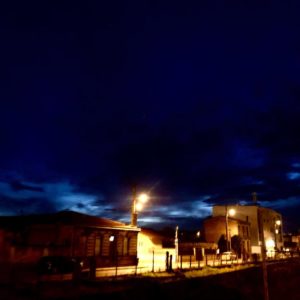 De la pluie sous le soleil. Chaque goutte sur les plantes étincelle et des traits d’argent strient le décor urbain. L’astre éblouit entre coin de ciel bleu et nuages fumeux.