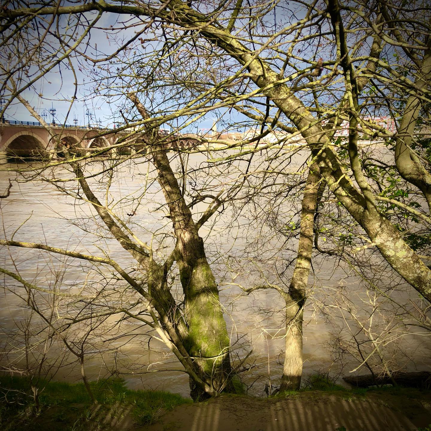Longue promenade post tempestaire avec une amie, afin d’aller voir comment se porte la Garonne : déjà fortement redescendue mais de mauvais poil, elle grondait comme un océan, avec un courant brutal et des tumultes maritimes. Rentrés en allant admirer la flèche Saint-Michel presque entièrement dégagée, dorée sous le soleil de fin de jour.
