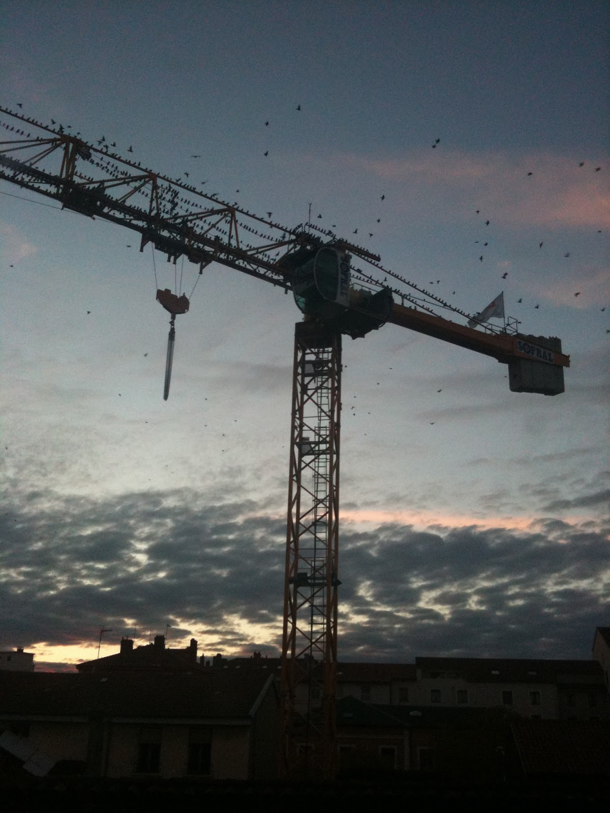 Au bout d’un moment, j’ai levé le nez de ma lecture et suis allé voir à la fenêtre. Des oiseaux, tant d’oiseaux: incroyable, et ce tintamarre! Sur l’immense grue qui domine mon coin de quartier, une grande foule de volatile, étourneaux je suppose, venaient de se jucher. Chaque centimètre de filin, la moindre surface, supportait une virgule noire. Je suis resté un long moment à les regarder, tandis que le soleil déclinait. Un perchoir géant, planté en pleine ville: je me sentais partagé entre émerveillement et hilarité.