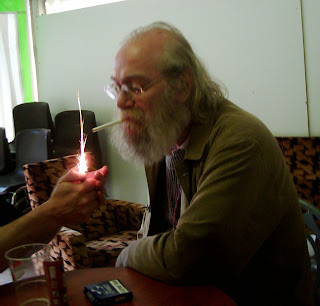 Content mais rompu, je cours encore: il me faut reprendre mon bagage à la consigne, avant de rejoindre mes habituels compagnons de soirs parisiens: Daylon, Calvo et Jean. Une copine libraire arrive en même temps que moi au resto nippon (réaction des autres quand je els avait prévenus: « Quoi, André, une fille?!? »). David est dans une forme éblouissante, il fait des étincelles. Daylon parle tellement vite qu’on ne comprend pas tout. Jean s’inquiète que la demoiselle se sente délaissée et dépassée. Retrait ensuite vers notre pub non moins habituel, à l’étage duquel tout n’est que calme et lumière tamisée, tandis qu’au RdC s’entasse une foule rugissante. Clic-clac, les deux photographes mitraillent, David continue à faire des étincelles et à Bob-l’épongisé, ils sont déchaînés, les projets fusent, je me sens remonter à bloc et parviens à ne pas penser au triste lendemain qui m’attend.